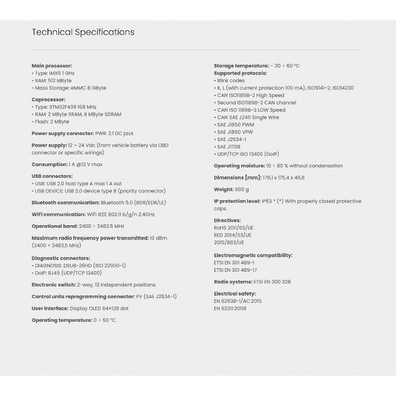 TXT MULTIHUB is equipped with a practical backlit display that gives it great usability and the possibility to view the information based on three types of messages: 1.communication mode with the display unit 2.charging voltage of the battery in the vehicle it is connected to 3.operating status that can be standard diagnosis, DoIP Wi-Fi, DoIP Ethernet, Pass-Thru it is a technologically advanced solution, rich in unique technical and constructive features, such as: the possibility to operate in 5 environments, the presence of a built-in display, the IP53 certified rugged design, an intelligent connectivity guaranteed by the Linux operating system, the management of DoIP, Pass-Thru protocols and much more. At all times it guarantees unparalleled performances so to complete operations the best way possible, with maximum customer satisfaction.